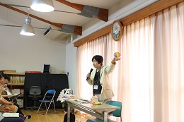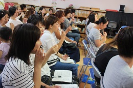 6月21日(火)は午後1時から子育て講座を行いました。講師は深谷市教育研究所専門員の吉井恵美子先生です。演題は「子育てと親の役割」です。子育てにマニュアルはあっても絶対はないというお話から、身に付くまで教えるのが「躾(しつけ)」ですよとお話しいただきました。これは園にも言えることです。やり始めたら、きちんと継続し、見届けるまでの根気が大切だと改めて考えました。また、正しい発音をするために大切な「舌」の運動を具体的に教えていただきました。小さな参加者にはぺろぺろキャンディーを、そしてお母さんたちにはチョコポッキーを用意してくださり、舌の柔軟さを育てる方法を学びました。乳幼児期が大切だということです。給食もしっかり噛んで、ごくっと飲み込んで、種があれば選んで、口の中の活発な動きを意識して指導したいと思いました。