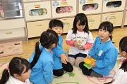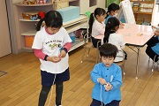 新年明けましておめでとうございます。本年もよろしくお願いします。14日間の冬休みが終わり、3学期が始まりました。大きな荷物をもって、また、竹馬をもって園児たちが元気に登園してきました。今日は、全員が登園しました。登園後、室内で好きな遊びを始めました。中には3学期に練習するこまで遊ぶ子もいました。久しぶりに子どもたちの元気な明るい声が園舎に響きました。始業式では、3学期の目標として、すべてのことに全力で取り組むことを伝えました。