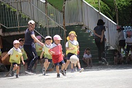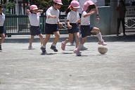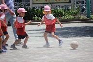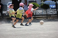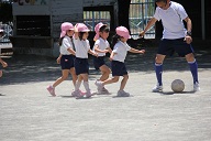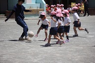 ボールに食らいつく 五月なのに今日も暑くなりました。コーチとも直ぐ仲よくなり園児たちは、待ちかねたように元気にサッカーの試合を楽しみました。