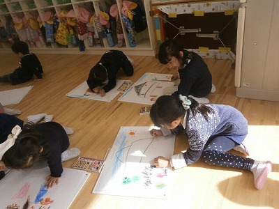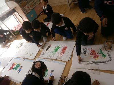 うさぎ組、豆まきの絵を描いています。