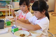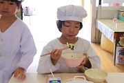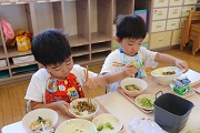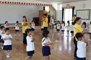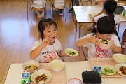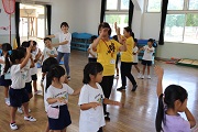 花園音頭の会の皆さんに花園音頭の指導を受けました。ばら組のみんなは、昨年も踊っているのですぐに思い出したようで、しっかり踊っていました。ぱんだ組のみんなは、初めてなのでしっかりおばあちゃんの踊りを見ながら頑張りました。練習後の給食は、みんなしっかり食べました。4月ごろに比べると食べる量も増えましたね。