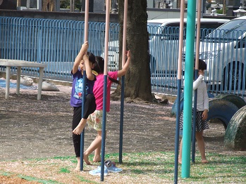 懐かしい園庭、遊具で遊んだり、築山に登ったり