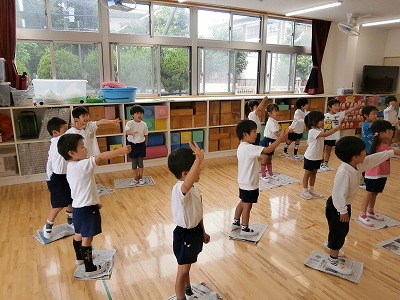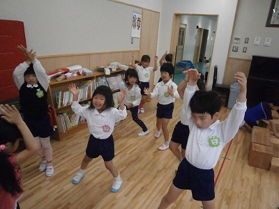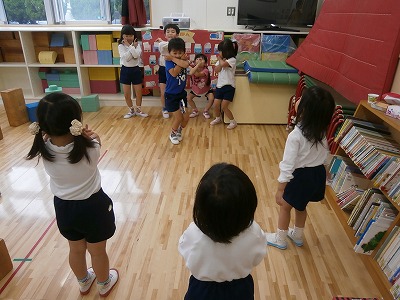 それでもリズム室では、子供たちの元気な声に包まれました。リズムにのって何度も繰り返し踊っていました。さくら組が、うさぎ組に踊り方を教えていました。