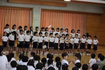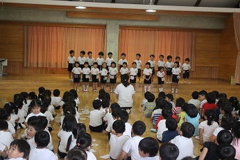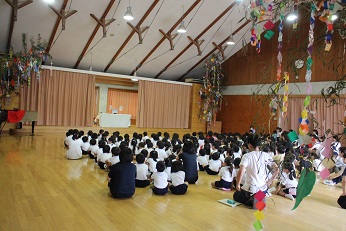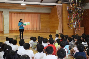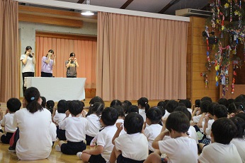 7月3日(水)は、みらい幼児園おかべとおかべ幼稚園合同の「七夕まつり」でした。大ホールいっぱいに飾られた笹飾りのなかで、4歳・5歳のお友達が歌を披露してくれました。先生方からは、七夕のお話の由来をわかりやすくペープサートで紹介していただき、七夕の手遊びを楽しみました。元気な歌声といっぱいの笑顔、天の神様に届いたかな?みんなの願いがかないますように!