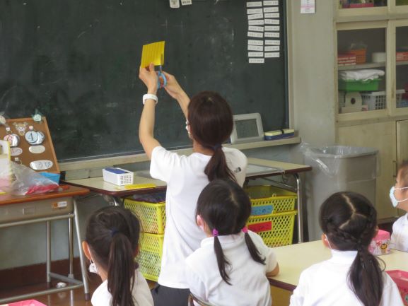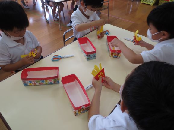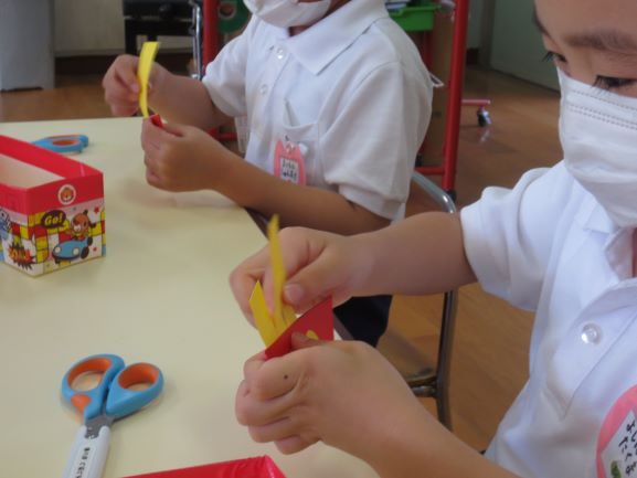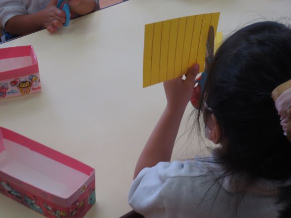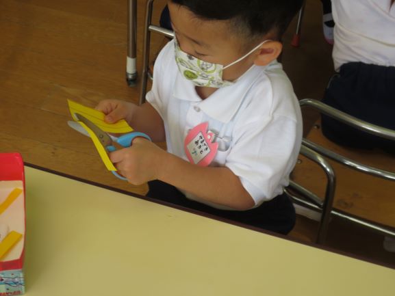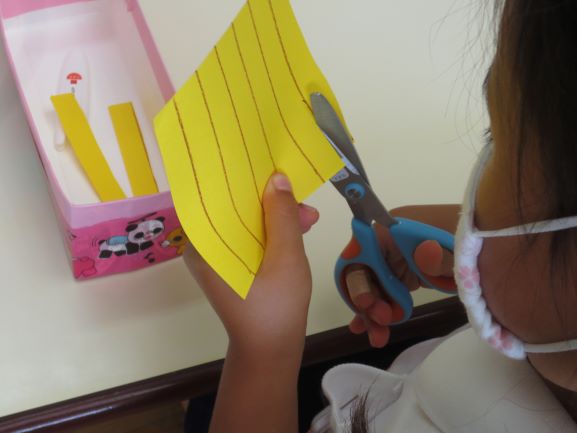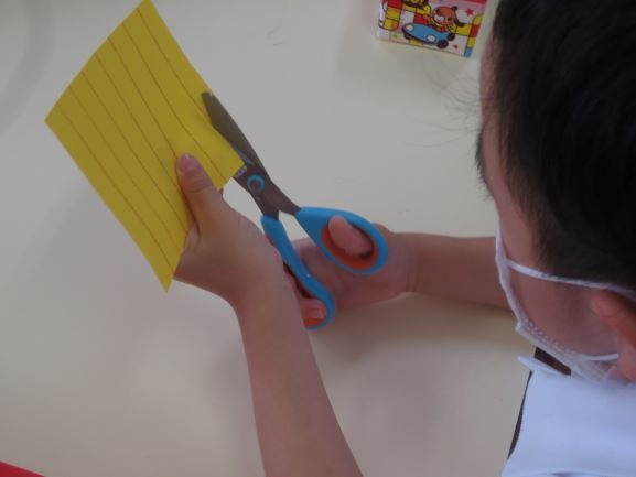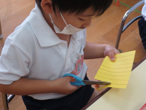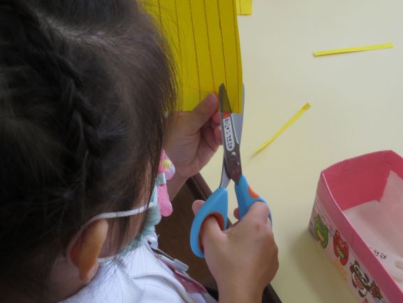 ハサミの刃の出し方、しまい方、切り方は胸の前、下から上に向かって切る。指を挟みの前におかないなど、見様見真似ですが、安全にできるように習いました。補助の先生もそばでしっかりと教えてくれたね。