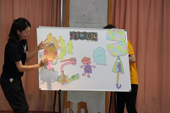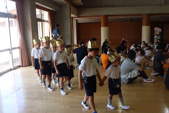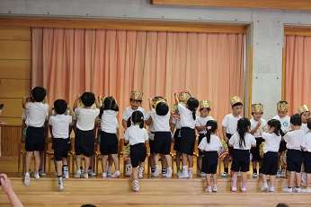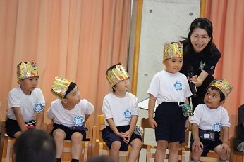 6月25日(火)は6月生まれの誕生会を行いました。幼稚園は12名という、大勢のお友達が一つお兄さんやお姉さんになりました。野菜の実りの時期を迎えるこの時期の生まれです。3歳児は5人、「好きな食べ物」もいちご・みかん・バナナ・ブドウと色とりどり。4歳児は4人、「大きくなったら何になりたいの」という質問にパイロット、ドラえもん、プリンセス、イチゴ農家と自分らしさが出てきます。5歳児は3人、空手の選手、車に関わる仕事、レーサーです。夢は変わっていくのでしょうが、そのときその時、あこがれを抱いて夢を語る姿を頼もしく思います。先生たちからは「ようかいじーまん」のパネルシアターをプレゼントしていただきました。