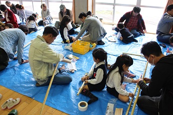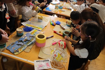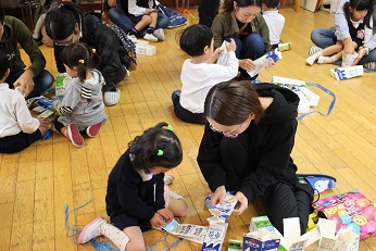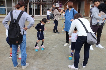 10月27日(土)は、土曜保育参観を行いました。雨音に目が覚めた土曜日でしたが、園児たちの登園が始まるころには雨もやみ、外遊びができました。覚えたての「なわとび」をお家の方に教えていただく場面も多く見られました。そして、今日のメインの竹馬・ぽっくり作りです。3歳は牛乳パックのぽっくりを製作しました。お家の方にお手伝いをしてもらって、出来上がっていく竹馬やぽっくりに目を輝かせていました。色をつけ、絵を描いた自分だけの竹馬やぽっくりは宝物のように大切で、外で遊んでほこりに汚れることが悲しかった園児もいました。お家の方とつくる思い出は、園児の心にこんなに大切に残るのだなと心打たれた一場面でした。上手に歩けるころには、青空も見られました。天気も心もほっこり温かい土曜日となりました。来週からは、上手に乗れるよう練習する園児の姿が園庭に見られるようになります。