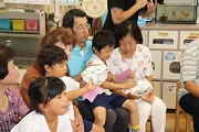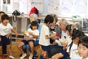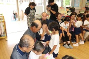 おじいちゃんやおばあちゃんにだっこしてもらい、どの子もうれしそうですね。おじいちゃんやおばあちゃんの中には、今朝、茨城県や千葉県から来てくれた方もいるそうです。園児たちにとっては、久しぶりにおじいちゃんやおばあちゃんにあった子もおり、本当にうれしそうです。