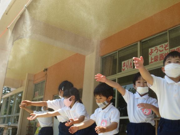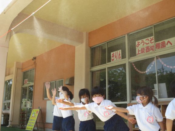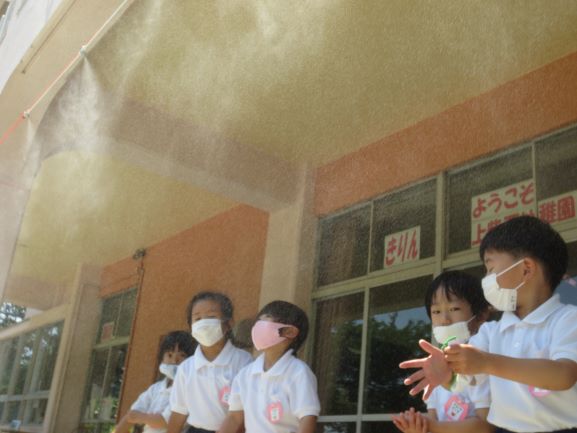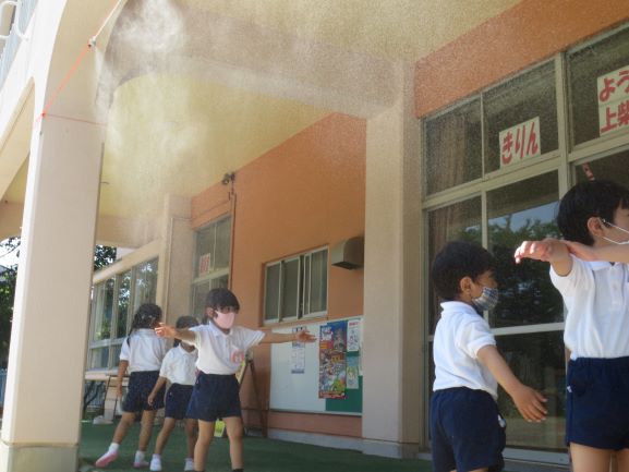 きりん組の保護者が、家庭で利用しているミストを貸してくださいました。普段家で使っているものをわざわざ園の昇降口のテラスにお父さんが設置してくださいました。有り難いです。