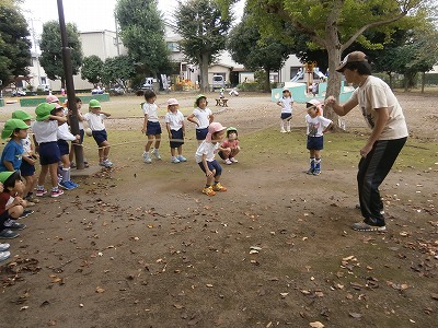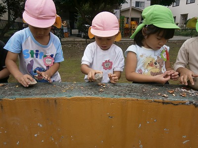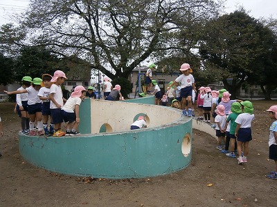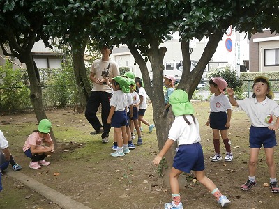 公園では、遊具で遊んだり、ドングリや、椿の実を拾ったり、ボールや長縄で遊んだりしました。ドングリを石で割って中身を取り出し、かじろうとしている子もいましたよ。秋の季節を感じることができました。