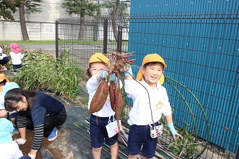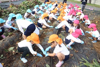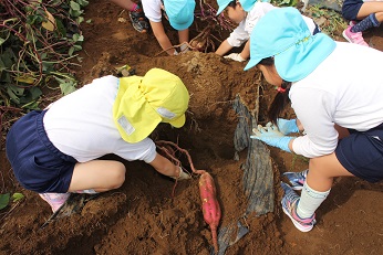 10月16日(火)は、幼稚園の畑のサツマイモを掘りました。葉っぱが緑の海のように広がって、大きく広がりすぎたかな、お芋に栄養が届いたかなと心配でした。二人で一株を掘っていきます。ゴム手袋をしましたが、掘った土が洋服に模様を作るほど、一生懸命に掘りました。大きいお芋があった株とスマートなお芋が顔を出した株、いろいろでした。「あったよ」の声があちこちから上がり、楽しい芋ほり体験となりました。お家に持ち帰りましたが、食卓にのるとまたお話が広がることでしょう。