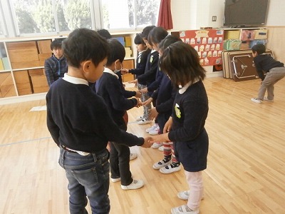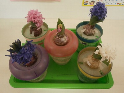 11月から部屋で水栽培をしているヒヤシンスがきれいな花を咲かせました。年長児が毎日、世話をしているクロッカスも、もうすぐ、咲きそうです。楽しみですね。