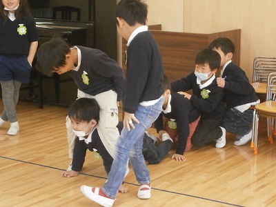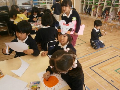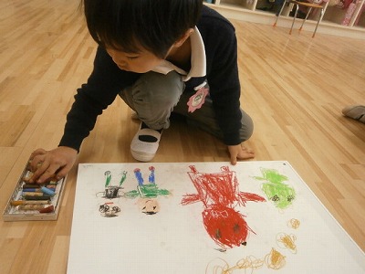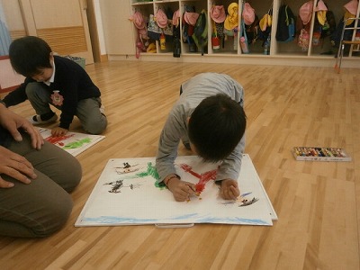 うさぎ組の豆まきの絵の仕上げの場面です。