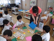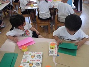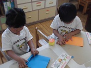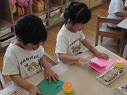 5歳児・ばら組のみんなが自分で使うカードホルダーを作っていました。先生の話を聞きながら、画用紙を折ったり、のりをつけたりしながら自分のカードホルダーをつくりました。紙を折る、貼るなどの作業を通して、工作の感性を養っていきます。