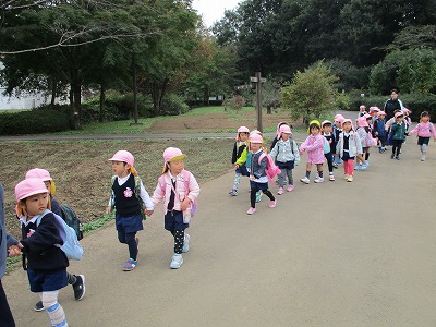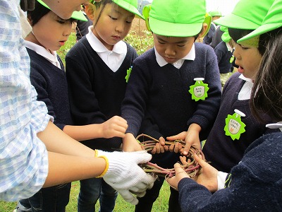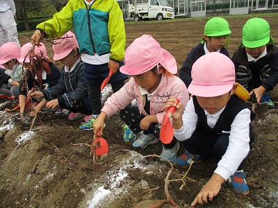 雨が心配されるような曇り空の下でしたが、川本の、農林公園へいもほりに行ってくることができました。手やスコップを使って、折らないように上手に芋を掘ることができました。「5個もついてるよー。」「大きいお芋が掘れたー。」とうれしそうな声が聞かれました。