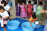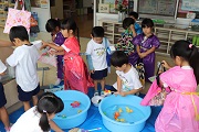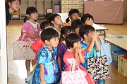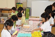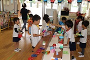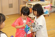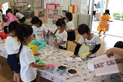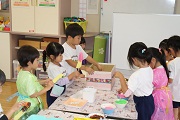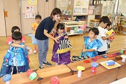 5歳児ばら組が、親子ふれあい祭りで行ったお店やごっこを自分たちで体験しました。そして、4歳児ぱんだ組のみんなも招待しました。4歳児ぱんだ組のみんなは、ビニールで作った浴衣を着て、お店やごっこに参加しました。4歳児ぱんだ組のみんなは夢中になって楽しみました。5歳児ばら組のみんなも自分たちが楽しむだけでなく、4歳児のみんなにもやさしく話をしながら、みんなでお店屋ごっこを楽しみました。お店屋ごっこを通して、人とのコミュニケーションの仕方を学びました。