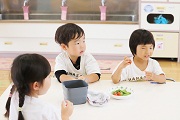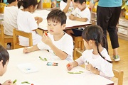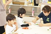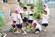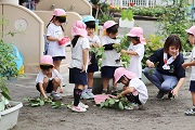 園児たちが毎日水くれをしてきた野菜、枝豆、ミニトマトが収穫できるようになりました。今日は、みんなで収穫し、試食をしました。みんな配られた野菜を完食しました。