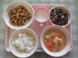 ソイ丼 かきたま汁 バリバリサラダ 牛乳
