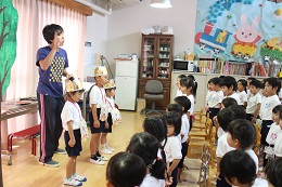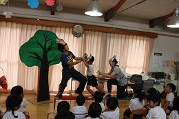 6月27日(火)は6月の誕生日会でした。3歳児クラスは6月生まれはいませんでした。4歳児(しか)クラスに1名、5歳児(きりん)クラスは2名、合わせて3名のお友達がお誕生月を迎えました。給食もミニケーキ付です。歌を歌ったり、劇を楽しんで、時間を過ごしました。「アナと雪の女王」のエルサにあこがれている園児や野球選手、ケーキ屋さん、それぞれの夢を語ってくれました。劇は「3びきのやぎのがらがらどん」をやりました。年長さんがやぎ役を、田部井先生のトロル役の迫真の演技には泣き出す3歳児も。泣いたり、笑ったり、楽しい時間を過ごしました。