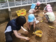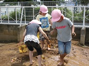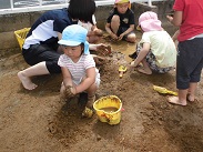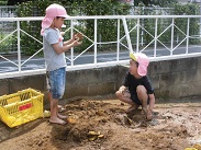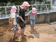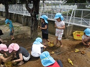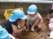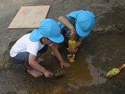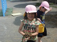 週の始めから始まったどろ遊び、いよいよ子どもたちもどろ遊びに慣れ、汚れることを気にせず、十分土の感触を楽しみだしました。お母さん、服の洗濯よろしくお願いします。