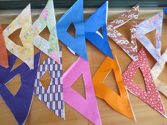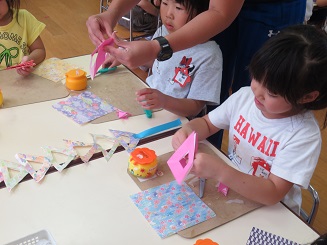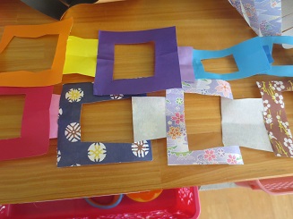 テーマは色紙を自分のセンスできれいに組み合わせで2種類選び、作ります。それをみんな繋げ合わせ竹に飾りつけます。