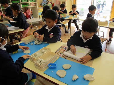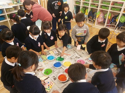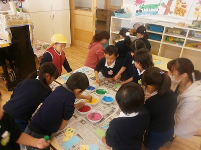 今日は昨日に引き続き、いも版を使って、ハンコ押しを楽しむ姿が見られました。うさぎ組も、さくら組に、教わりながら、ハンコ押しをしていました。