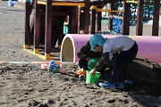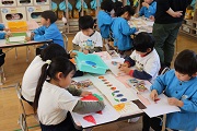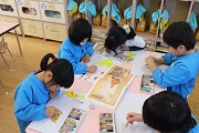 朝の活動から園児たちは元気に一日をスタートしました。竹馬の練習をする子、みんなとボール遊びをする子、砂場遊びをする子などみんなが好きな遊びを楽しんでいます。外の活動後、保育室に戻って3月の保育参観に向けての準備を始めました。