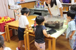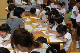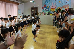 7月13日(水)は今年度初めての「子育てひろば」でした。20組ほどの未就園児と保護者の方の参加がありました。あいにくの雨で、室内での遊びになってしまいましたが、5歳児・4歳児の部屋を移動しながら、遊びに参加していました。小さな子をみると、なんとなくお兄さんやお姉さんらしく振舞う園児の姿が印象的でした。しか組さんが、歌を披露したり、いっしょに踊ったりと楽しみました。教育委員会の先生とのじゃんけんや絵本を楽しんでいました。