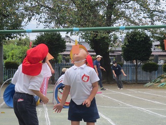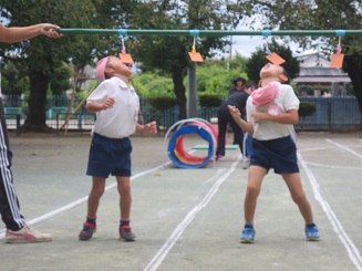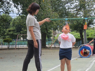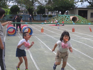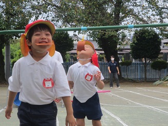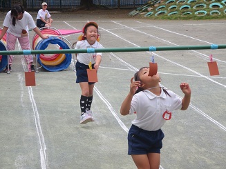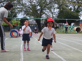 障害走のフィニィッシュはお菓子銜えです。まさしく、いろいろな動きが体験できるぞー。
