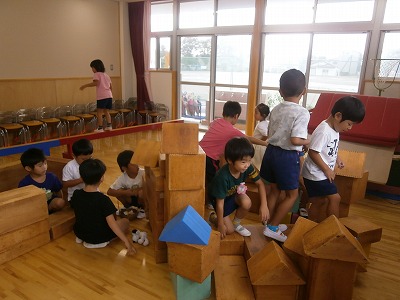 本日は雨のため、室内での活動が中心となりました。うさぎ組は、パラバルーンを練習したり、大型積み木を使って遊びました。