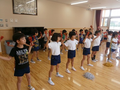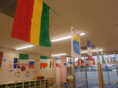 さくら組は、運動会で飾る、旗を作りました。室内に飾ってありますので、あとでご覧ください。