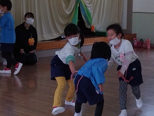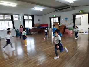 育実習生のお姉さん先生と一緒にしっぽ取りゲームを楽しみました。ルールがよく分かっていて、チーム替えをしながら何回もやって遊びました。