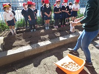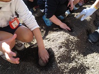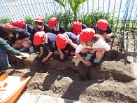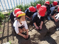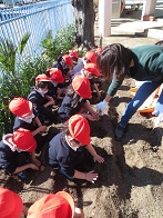 園の畑にきりん組さんたちが、来年度のためにジャガイモを植えました。普段食べているジャガイモが、さらに増えてたくさんの新じゃがとなりますように・・・・。
