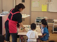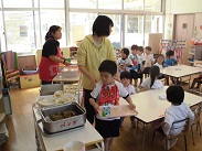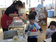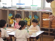 4歳児ぱんだ組の園児が、初めて給食を食べました。今日の献立は、うどん、磯部上げ、サラダ、牛乳でした。牛乳はきらい、うどんはきらいなどなど、少し大変な給食指導になりましたが、おかわりをする食欲旺盛な子もいてひと安心でした。