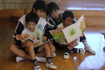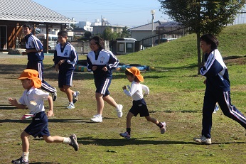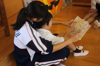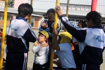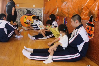 10月23日(水)は3日目の岡部中学校の3年生の幼稚園訪問でした。今日は、5歳児の年長さんクラスです。広い園庭をとにかく走って、走って、園児たちは本当に楽しそうでした。あっという間に外遊びの時間がすぎて、絵本の時間となりました。幼稚園では、一番お兄さん。お姉さんのきりん組さん、お膝にのせてもらってちょっと照れくさそうでしたが、すぐに慣れて、とてもうれしそうでした。ありがとうございました。