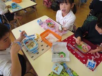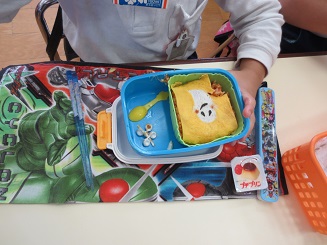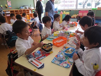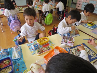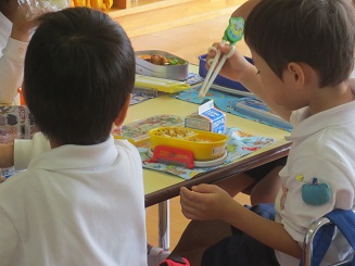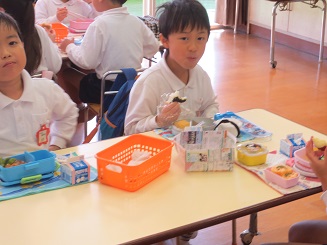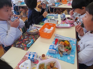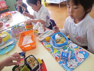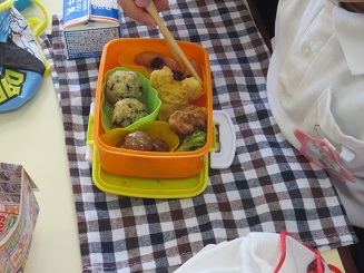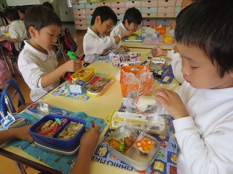 また、先生は食育指導も考えて、ご飯の食べ方、栄養、なども話題にだし、食事がすすむように、嫌いがなくなるように、お弁当の時間も盛り上げていました。美味しいお弁当をいつもありがとう!