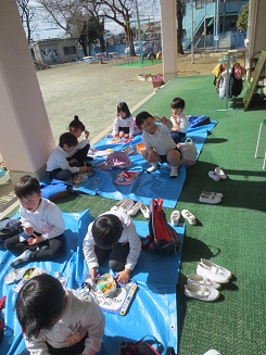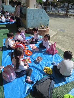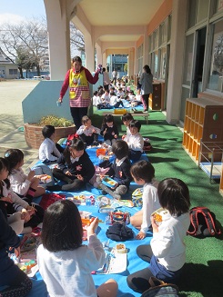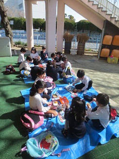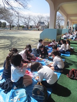 陽の光に照らされたみんなの顔やお弁当、気持ちいいいっそう会話も弾むお昼でした。桜の枝には花はありませんが、お花見気分、春よこい。