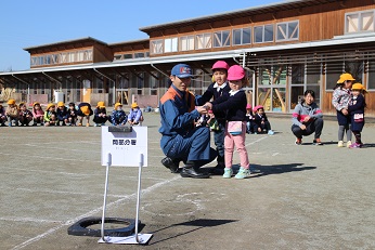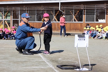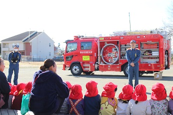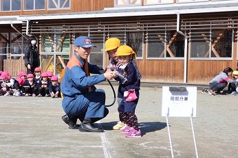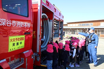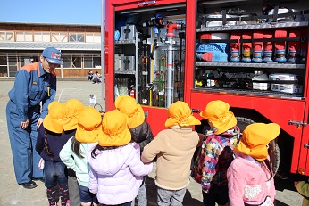 3月6日(火)は、深谷市消防本部岡部分署の方が幼児園、幼稚園を訪問してくださいました。今は、春の全国火災予防運動(1日~7日)の実施中です。消防士さんからお話を聞き、ジェットシューターという水鉄砲のような消火器での消火を実際に体験させていただきました。そのあと、ピッカピカの消防車を間近に見せていただき、説明をしていただきました。「これなあに?」といろいろな設備に興味津々でした。お約束は、今日家に帰ったら、「うちは火災警報器ついてる?」と聞くこと。できたかな?
