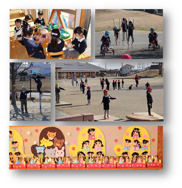 ※写真は年中児の紙で作ったお雛様と今日の子どもたちの様子です。