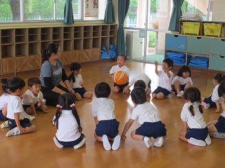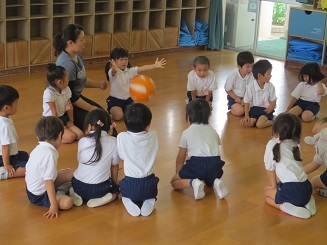 きりん組さんが、輪になってボールを手でついて取って、順番に回していました。これだけだって楽しい園児たち。ボールを手でついて取るための強さの加減、キャッチするタイミングも運動感覚となります。慣れてくると、ボールを向かい側の人に投げてキャッチします。ビーチボールなので強いと弾んでしまいますが、この失敗の「あいてて」が楽しいそうでした。輪になってボールが弾み心も弾んでいました。輪って楽しいなぁ