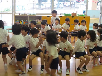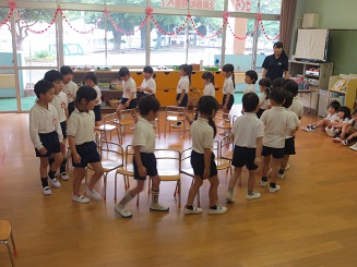 さくら組さんは輪になって椅子取りゲームです。四月から習った歌を先生のピアノの伴奏に合わせて歌いながら、ピアノの曲が止まったところで、イスに素早く座ります。