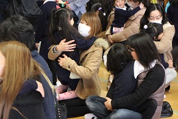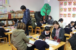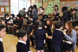 3月2日(木)は、朝から保育参観を行いました。あいにくの曇天でしたが、5歳児さんは今まで練習した竹馬の成果を見ていただいたり、1年間の思い出やお家の方への感謝の心を伝える会を準備していました。4歳児のクラスは、年長さんになったらがんばりたいことを大勢の前で一人一人が発表しました。そのあとは、お家の方といっしょに思い出のアルバム作りです。うれしそうな表情が印象的でした。5歳児さんは、感謝の手作りのお花をプレゼントして、みんなだっこしてもらっていました。照れながらも、ニコニコ、やっぱりうれしそうでした。外遊びのころにはお日様もでて、元気に遊んで懇談会の終了を待ちました。
