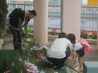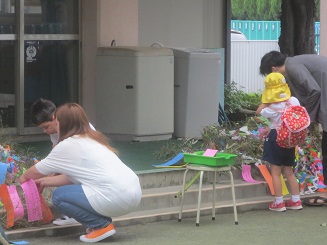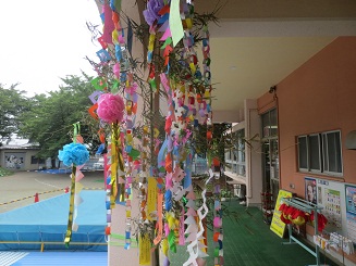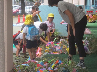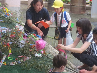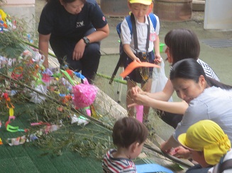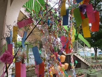今年は、たまたま竹が手に入り園でも七夕を楽しむことにしました。七夕祭りも間もなくです。保護者の方にも急ですが協力してもらい、きりん組さんさくら組さんそれぞれの竹に飾るために、短冊にお子さんの夢・願事を書いてもらいました。有り難うございます。朝から飾り付けモ協力してもらい昼までに立ち上げることが出来ました。 みんな夢がしっかりかけていました。夢があるは、良いこと。また、いろいろな人に話したり見てもらうことも必要です。