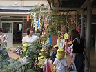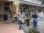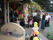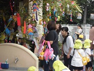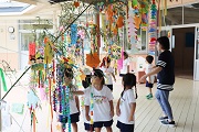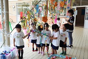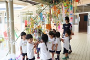 7/3に園児たちが準備していた七夕かざりを竹ざおにかざりました。自分たちで作ったかざりを竹ざおにかざり、満足そうでした。また、一人ひとり自分の願いを短冊に書きました。願いが叶うといいですね。降園時にお母さんたちが七夕かざり、短冊を見ていってくれました。子どもたちの願いがわかったでしょうか。