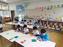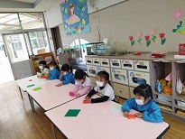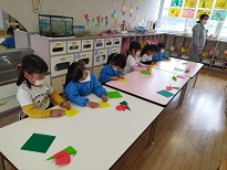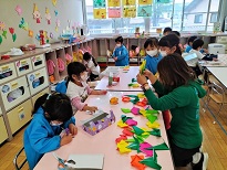 折り紙でチューリップとタンポポを作りました。みんな真剣に話を聞いて取り組み、よくわからいところは、考えたり友達と相談したり教えあったりして、完成させました。