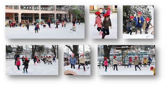 今日は、昨晩に降った雪が園庭に積もりました。子どもたちの記憶では初めての大雪です。その積もった雪の上で子どもたちはいっぱい楽しい遊びをしました。雪合戦!雪だるまづくり!雪兎づくり!等々。子どもたちは寒さに負けず元気いっぱいでした。