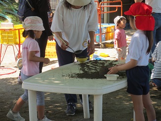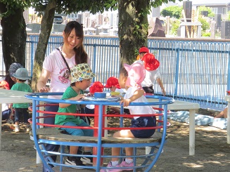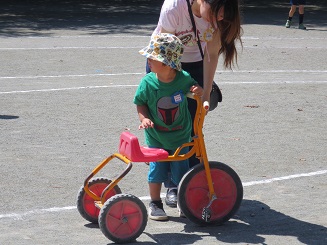 いつも遊んでいる園庭で、小さい子を一緒に入れて元気によく遊びました。
