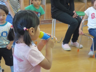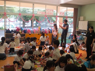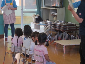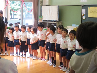 また、部屋に入り、年中さんがアンパンマン体操、年長さんが室内遊び、ままごと、パズル、お絵かき、色塗り、積み木、等々で 最後に歌を披露しました