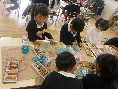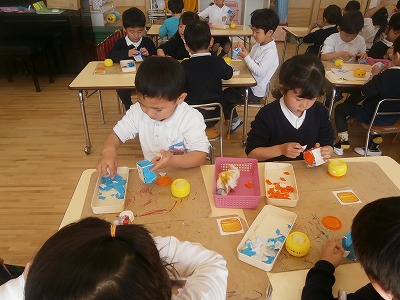 うさぎ組、豆を入れる枡づくりの様子です。