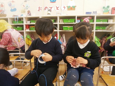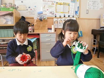 さくら組、マフラー編みと、豆を入れる枡づくりの様子です。